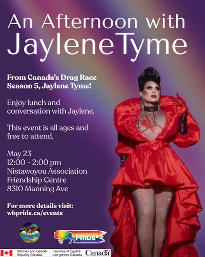 From Canada’s Drag Race Season 5, it's Jaylene Tyme! Join us at The Nistawayou Association Friendship Centre to enjoy lunch and conversation with Jaylene. This event is open to all ages and free to attend. No registration is required.